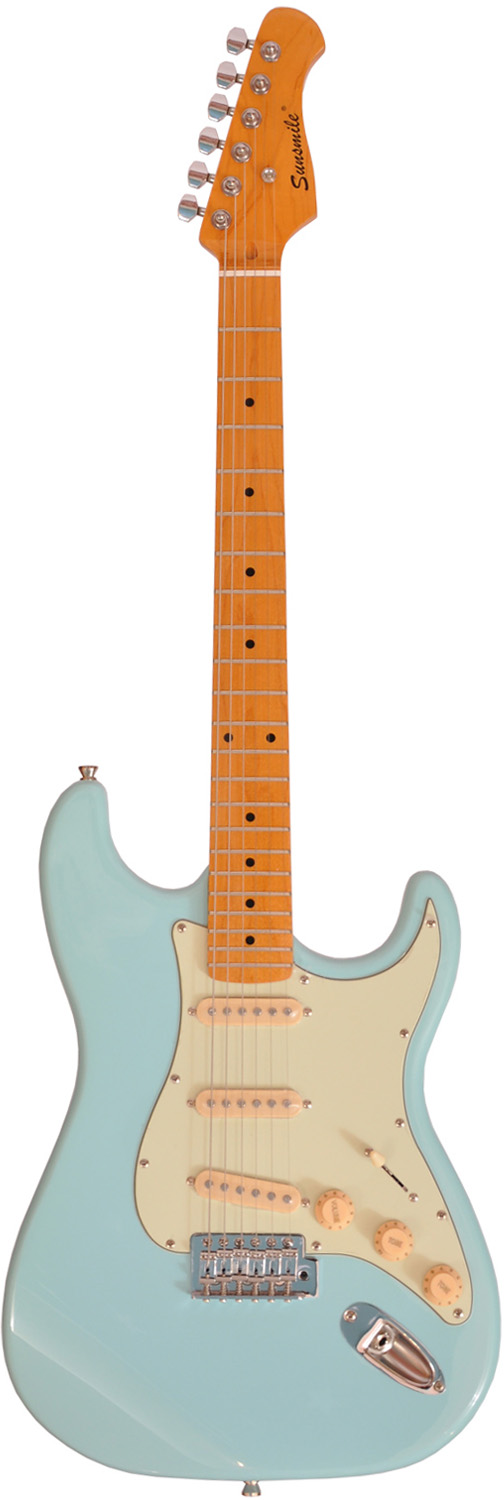 Bolt-On Construction Basswood Body Canadian Maple Neck Maple Fingerboard Nut Width: 42mm Radius: 305mm Body Thickness: 43mm Die-cast Tuning Machines 648mm/ 25.5", 22 Frets 1V, 2T, 5-Way Selector S-S-S Pickups Vintage Tremolo Chrome Hardware 3-Ply Mint Green Pickguard