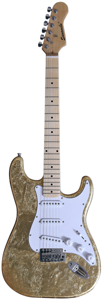 Bolt-on ConstructionPaulownia Body with Gold leaf finishBody thickness 44.45mmHard MapleMaple FingerboardDie-cast Tuning Machines648mm/25.5", 21 Frets1V,2T, 5-Way SelectorS-S-S PickupsVintage TremoloChrome Hardware3-Ply White Pickguard