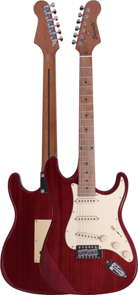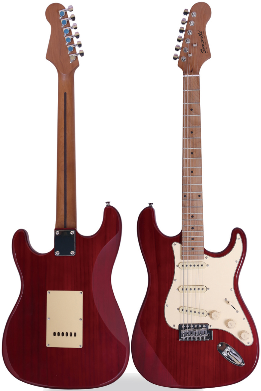 Bolt-on ConstructionPaulownia BodyRoast Maple Neck with Rosewood StripeRoast Maple FingerboardDie-cast Tuning Machines648mm/25.5", 22 Frets43mm Bone Nut1V, 2T, 5-Way SelectorS-S-S Alnico PickupsVintage TremoloChrome Hardware3-Ply Vintage White Pickguard