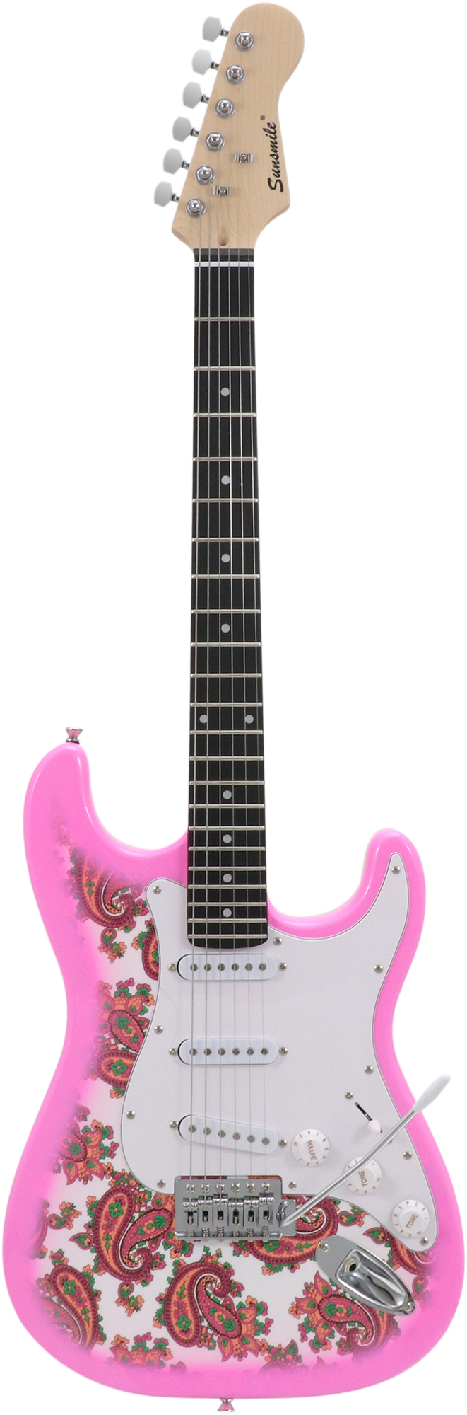 Bolt-on ConstructionPoplar Body with DecalMaple NeckEngineered Wood FretboardDie-cast Tuning Machines648mm/25.5", 22 Frets1V,2T, 5-Way SelectorS-S-S PickupsVintage TremoloChrome Hardware3-ply White Pickguard