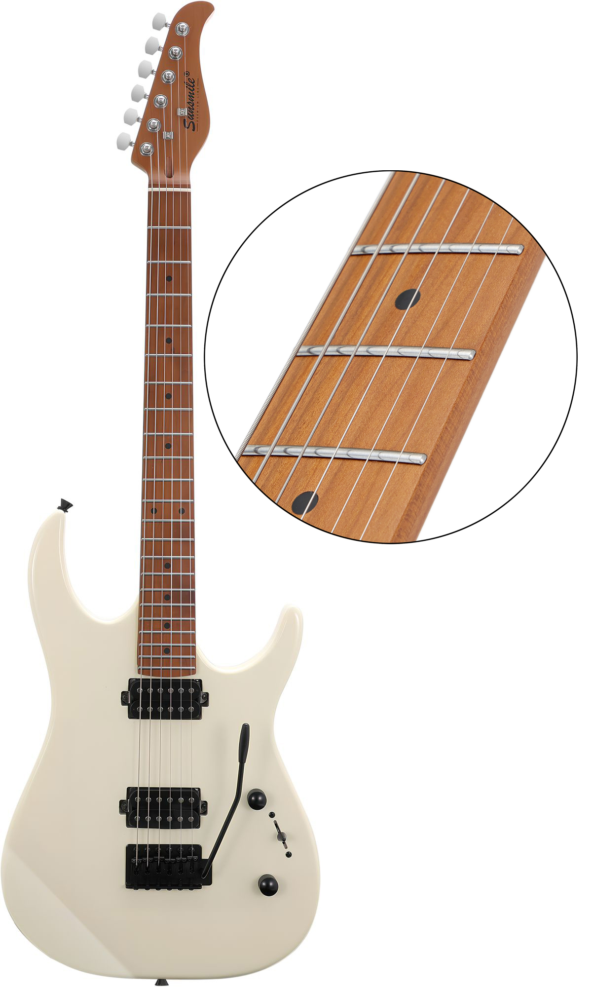 Bolt-on Construction Poplar Body Roasted Maple Neck & Fretboard Die-cast Tuning Machines 648mm/25.5", 22 Frets Rounded Fret Ends Invisible Fret Tangs GraphTech Nut 1V, 1T, 3-Way Selector H-H Pickups Vintage Tremolo Chrome Machine Head Black Tremolo & Knob