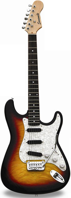 Bolt-on Construction Mahogany Body Quilted Maple Top Hard Maple Neck Poplar Laminated Fingerboard Die-cast Tuning Machines 648mm/25.5", 21 Frets 1V, 2T, 5-Way Selector S-S-S Pickups Contemporary Style Tremolo Chrome Hardware 3-Ply White Pearloid Pickguard