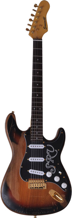 Construcci¨®n: JuntaCuerpo: Caoba con Spalted Maple TopDiapas¨®n: Palo De RosaClavijero: Grover EstiloClavijero: Die-cast Longitud De Escala: 25.5"Traste: 21Fonocaptor: S-S-SPuente: Vintage TremoloHardware: OroPickguard: Tres Capas Blanco