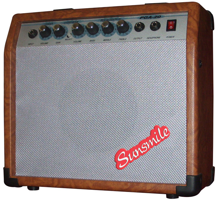 MODEL: PGA-20 POWER: 20W SPEAKER: 6" CONTROL: Normal volume, Gain, Switch ,Overdrive Volume, Bass, Middle, Treble FEATURES: Overdrive, Headphone DIMENSIONS: 33.5*15.5*32 (in) WEIGHT: 5.4KG